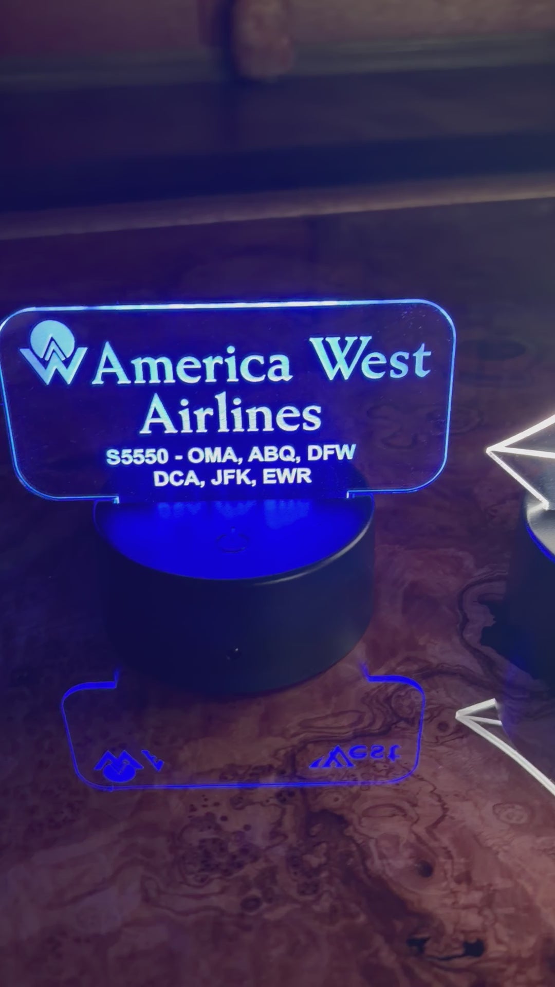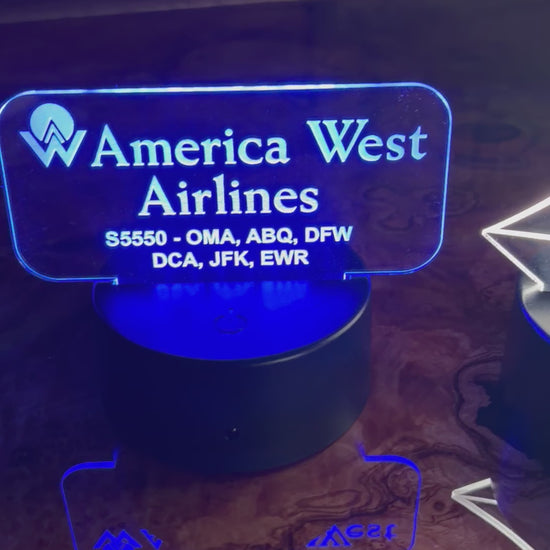 Another awesome art piece from Torenka Laser Creations! The iconic HP airplane tail logo laser engraved in crystal clear acrylic with a lighted base! These eye-catching accessories look right at home on your desktop or shelf with your other America West memorabilia.